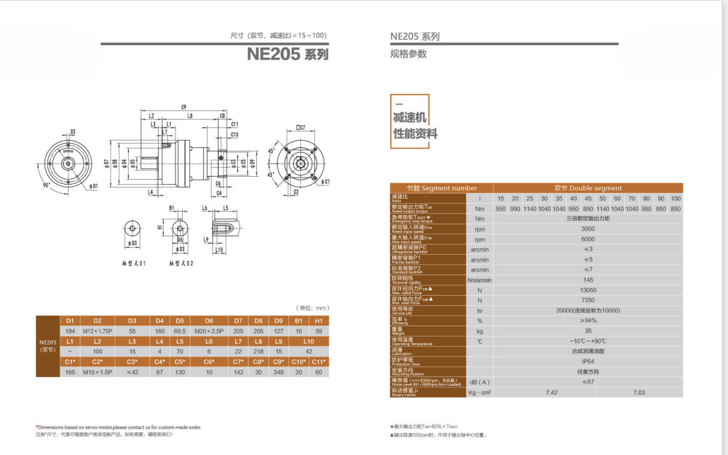 NE205系列超精密背隙行星減速機系列(P0): NE205系列精密背隙行星減速器系列(P1): NE205系列標準背隙行星減速機系列(P2):