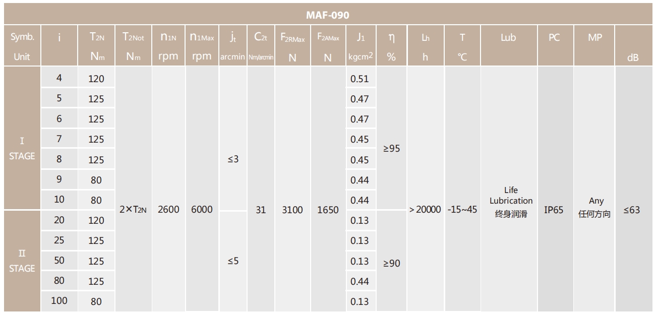 MAF-140-L2系列超精密背隙行星減速機系列(P0): MAF-140-L2系列精密背隙行星減速器系列(P1): MAF-140-L2系列標準背隙行星減速機系列(P2):