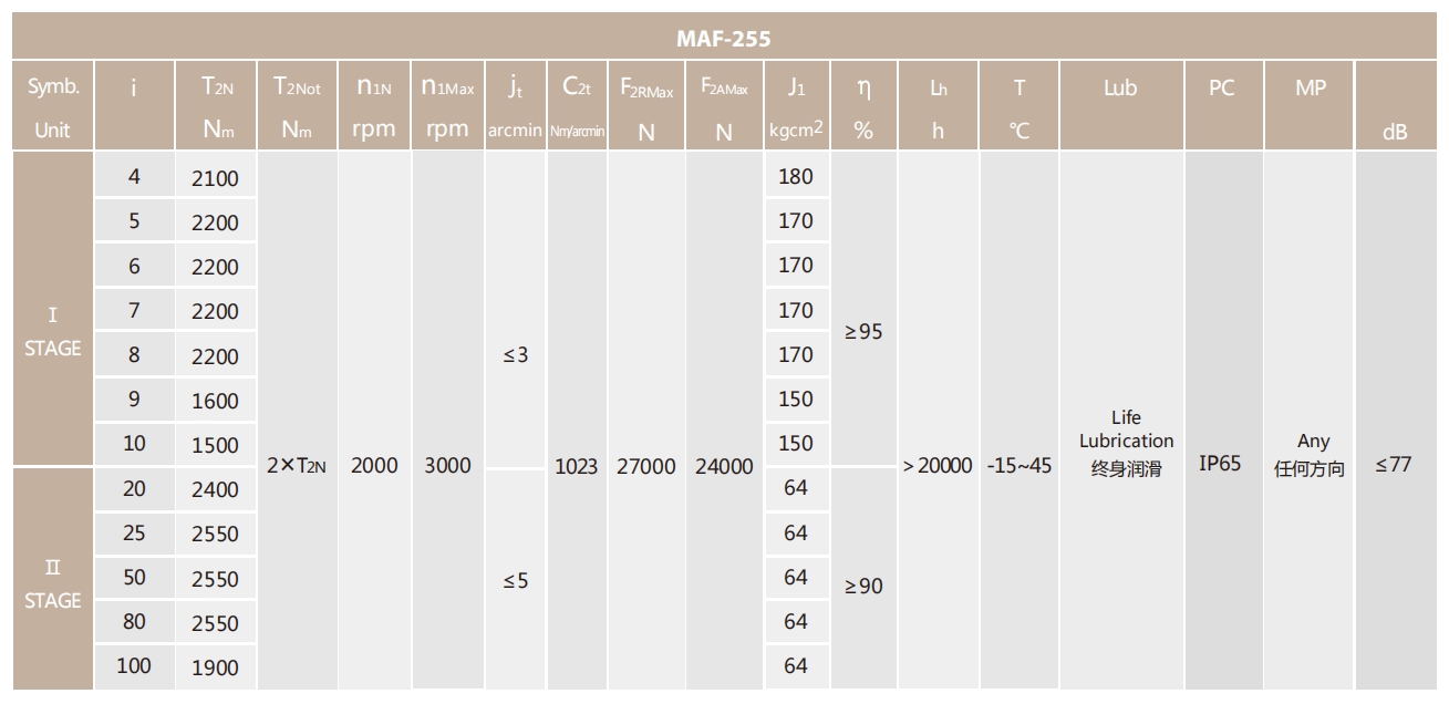 MAF-255-L1系列超精密背隙行星減速機系列(P0): MAF-255-L1系列精密背隙行星減速器系列(P1): MAF-255-L1系列標準背隙行星減速機系列(P2):
